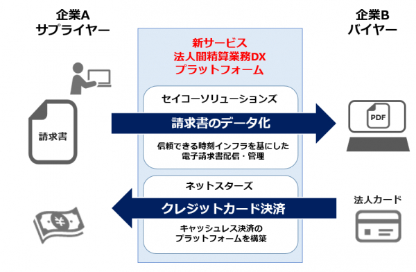 セイコーソリューションズの「電子請求配信」の機能・ノウハウと、ネットスターズの決済プラットフォームを掛け合わせ、精算業務のDX化の実現を目指します。国内の法人間決済は銀行振込が主流であり、企業の請求・支払い業務は改善余地が大きく、キャッシュレス化/DX化が必要であると言えます。特に少額の取引が多い企業や中小規模の企業との取引が多い企業においては、売掛金の未回収リスクも高まり、与信管理や請求・支払いの管理は人的コストとして膨らんでいます。これらの課題解決に向け、法人間取引におけるクレジットカード決済を導入する新サービスの提供を協業で取り組みます。サプライヤー企業側は入金の遅延削減や売掛金リスクの減少、入金の消込作業からの解放が期待され、バイヤー企業側は請求や支払い業務の電子化に対応でき、省人化・効率化を期待できます。信頼できる時刻インフラを基に電子請求書配信サービスを提供してきたセイコーソリューションズの強みと、キャッシュレス決済ソリューションを国内に拡げてきたネットスターズのプラットフォーム構築の強みを活かし、新たなソリューション提供に向けて協業を進めます。