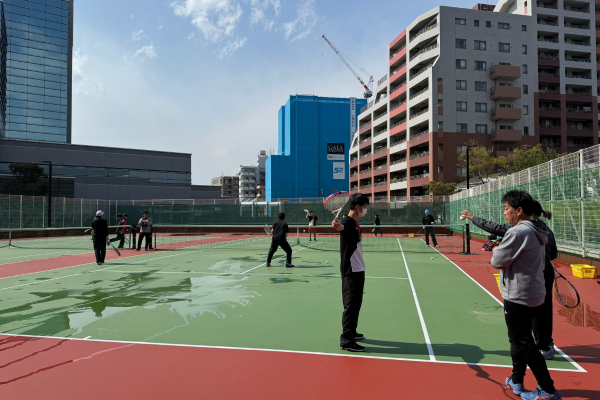 入社式の後はオリエンテーションや昼食会、毎年恒例のソフトテニス会を実施。江東区のテニスコートにて、取締役の此下をはじめ各社東京営業所のスタッフや実業団チームの選手、新入社員一同でソフトテニスやテニスをプレーし、これから共に働いていく仲間たちを歓迎しました。