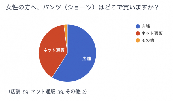 女性がパンツ(ショーツ)をどこで購入するかについて、「店舗」が59%、「ネット通販」が39%とブラジャー同様(2024年2月調査)店舗での購入が多い結果となりました。