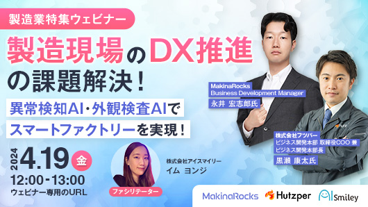この度は、製造業向けの異常検知AIを提供しているMakinaRocksと外観検査AIを提供しているフツパーの2社より製造現場のDX推進におけるノウハウをご紹介します。最新製造業AIに興味のある方はぜひご参加ください!