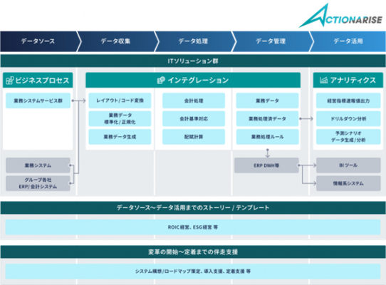 「ACTIONARISE」は、経営に必要なデータの生成から適切な収集・整理とともに、データに基づく経営判断とアクションの定着まで支援することで、スピーディかつ確実なデータドリブン経営への変革をご支援します。