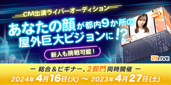 株式会社エムアンドティーティー(本社:沖縄県北谷町、代表取締役:井藤 三知子)が運営するエンターテイメント・ライブ配信アプリ【21LIVE(ニーイチライブ)】URL: https://21.live では、4月16日(火)より「CM出演ライバーオーディション」を開催。東京都内8カ所9面の屋外ビジョンで5月に放映する、新CMへの出演権を賭けたランキングを行います。