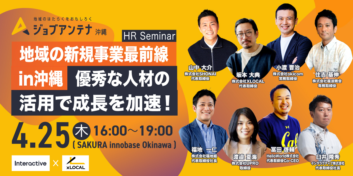 地域に特化した双方向な求人マッチングサービス「ジョブアンテナ」を運営しているインタラクティブ株式会社(本社:沖縄県宜野湾市、代表取締役社長:臼井 隆秀、以下「インタラクティブ」)は、都市と地方の人材流入を逆転する地方特化型のリクルートサービス「チイキズカン」を提供している株式会社XLOCAL(本社:山形県鶴岡市北京田字下鳥ノ巣23-1、代表取締役:山中 大介・坂本 大典、以下「XLOCAL」)と共催で、2024年4月25日(木)に沖縄にてHRセミナー「地域の新規事業最前線!in沖縄」を開催します。
