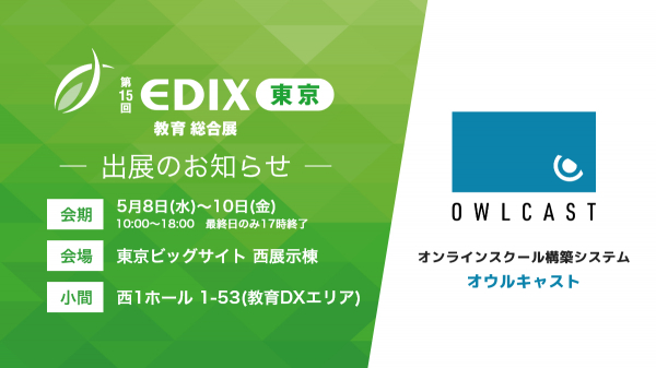 株式会社ストランダー(本社:東京都新宿区、代表取締役:青木大輔)は、2024年5月8日(水)~10日(金)に東京ビッグサイトで開催される「第15回 EDIX(教育総合展)東京2024」に、2024年春リリース予定の新製品「オンラインスクール構築システム オウルキャスト」を出展することといたしましたので、お知らせいたします。