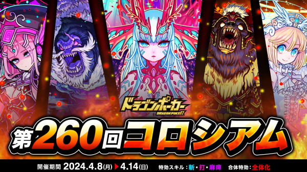 株式会社アソビズム(本社:東京都千代田区、代表取締役:大手智之)は、App Store・Google Playにて好評配信中のリアルタイム合体カードバトル『ドラゴンポーカー』で、2024年4月8日(月)より「第260回コロシアム本戦」を開催いたします。