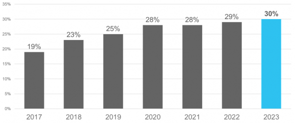 当社が2017年から行っている調査では、当社を通して職に就いた外国籍候補者の割合は、2017年は19%、2023年は30%。年々増加傾向にあることがわかりました。コロナ禍で厳しい渡航制限があった2020年、2021年の採用率は横ばいでしたが、2022年以降は上昇しています。国内の人材不足の影響や多様な人材の活用が徐々に浸透し今後、長期的に採用率は増加していくと考えられます。