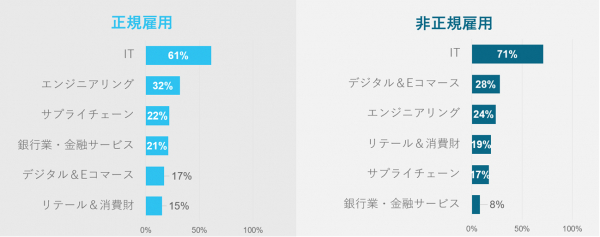 続いて、実際に外国籍候補者が転職をした業界・職種を見ていきます。下図にあるようにIT業界で多くの外国籍人材が活躍していることがわかります。IT業界はもともと人材不足が深刻で、多様な人材の活用がどの業界よりも急務だった背景があり、外国籍候補者が転職をしている業界のトップになっています。特にプロジェクトごとに人材がいれかわるような業界・職種については、非正規雇用として外国籍候補者が転職しやすいということが予測できます。
