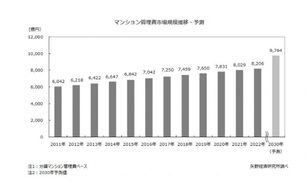 2030年のマンション管理費市場は2022年比19.0%増の9,764億円と予測する。人口減少や少子高齢化といった構造的な問題に加え、新築分譲マンション開発に適した用地不足や中古住宅流通市場の拡大等を背景に、新築分譲マンションの供給戸数の先細りが見込まれるものの、新築分譲マンションが供給され続ける限り、マンション管理市場は拡大する見込みは堅い。