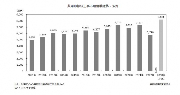 また、共用部修繕工事市場については、2030年は2022年比42.4%増の8,181億円と予測する。経年劣化に伴う小規模な修繕工事の増加や大規模修繕工事適齢期を迎えるマンションストック数の増加より、共用部修繕工事市場の中長期的な拡大が見込まれる。