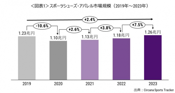 日本の2023年のスポーツシューズ・アパレル市場規模は1.26兆円で前年比7.5%増と、大きく回復しました(図表1)。2019年比でも2.4%増で、コロナ前の市場規模を初めて上回りました。