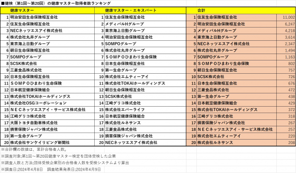 3月に終了した健検CBT(かんたんパソコン試験)第20回検定合格者を加えた最新団体企業別合格者ランキングTOP20(https://kenken.or.jp/2024/15543)を発表します。健康マスター・コース1位の明治安田生命、健康マスターエキスパート・コース1位の住友生命をはじめとしたTOP10企業は着実に合格人数をのばしていますが、健康マスターエキスパート・コースでTOKAIホールディングスが順位をあげています。