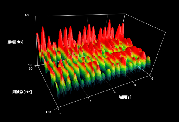 下図は、採取された有精卵内部の音をグラフ化したものです。60Hz周辺に所定の時間間隔で振幅が大きい箇所が見られますが、これが有精卵内部の音を示しています。