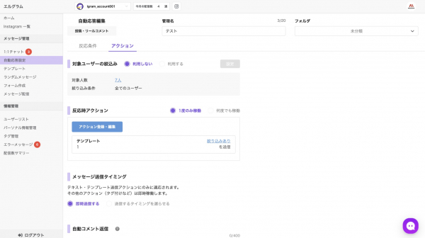 株式会社ミショナが提供するInstagram(インスタ)運用ツール「エルグラム」のDM自動送信機能に、アクションスケジュールやクイックテストなどが追加。自動配信数や配信先ユーザーの把握も可能に。