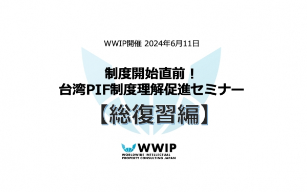 株式会社ワールドワイド・アイピー・コンサルティングジャパン (以下「WWIP」 : 東京都文京区) は、2024年6月11日(火)15:00~17:00に、「開始直前!台湾PIF制度理解促進セミナー【総復習編】」を開催いたします。