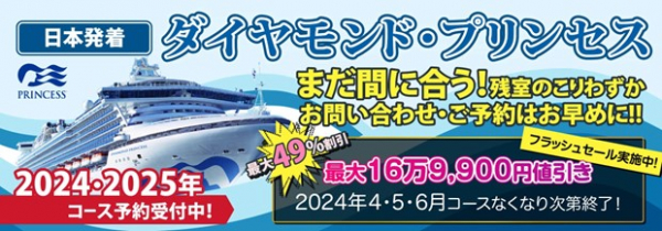 クルーズ予約サイト「ベストワンクルーズ」運営の株式会社ベストワンドットコム(本社:東京都新宿区、代表取締役:澤田秀太)は、本日より2024年6/22出発と7/10出発のダイヤモンド・プリンセス横浜発着クルーズの直前割フラッシュセール料金での販売を開始いたしました。