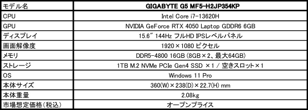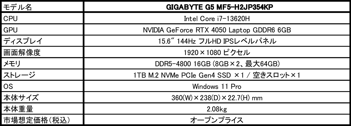 2024年4月19日 - GIGABYTE Technology Co., Ltd. 台湾・新北市 - コンピュータテクノロジーで世界をリードするGIGABYTE Technologyは、CPUに第13世代Intel Core i7プロセッサ、GPUにNVIDIA GeForce RTX 4050 Laptop GPUを搭載したエントリー向け15.6型ゲーミングノートPC「G5 MF5-H2JP354KP」を家電量販店(ソフマップ、ビックカメラ、ヨドバシカメラ)を通して4月20日より販売を開始いたします。価格は、オープンプライスです。