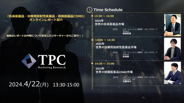 リサ・リューション事業を展開するTPCマーケティングリサーチ株式会社(代表取締役社長:松本 竜馬)は、4月22日に『抗体医薬品・治療用放射性医薬品・核酸医薬品CDMO』オンラインレポート紹介を開催いたします。