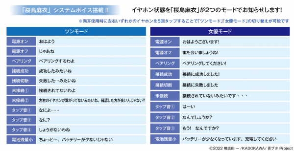 本コラボレーションモデルは、充電ケース天面に作品ロゴを印刷加工し、左右ハウジングにバニーガールをイメージしたモチーフアイコンをレーザー加工。ハウジングは起動時にLED点灯します。搭載音声ガイダンスは「桜島麻衣」の新規録り下ろしボイス。電源オンやオフ、ペアリング時やタップ音等の計11ワードのボイスを搭載し、コラボレーション初の2モード仕様となっております。メインは「ツンモード」11ワード、タップ5回切り替えにより「女優モード」10ワードを楽しめます。パッケージは「桜島麻衣」の描き下ろしイラストデザインとなっております。