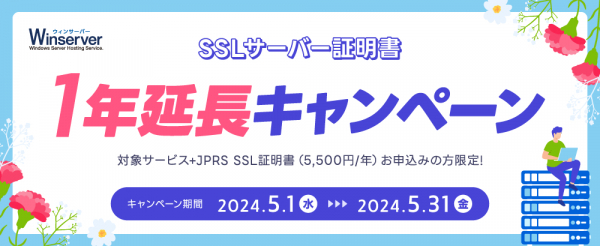 Winserver(ウィンサーバー/運営会社:アシストアップ株式会社、所在地:大阪府大阪市、代表取締役:青木 勝彦)は、2024年5月1日(水)~5月31日(金)の期間、SSLサーバー証明書1年延長キャンペーンを実施いたします。
