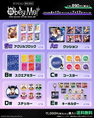 株式会社インクルーズ(東京都渋谷区、代表取締役社長 山﨑 健司)が企画・運営するフィジカルグッズのオンラインくじ「カワセルくじ」にて、4月17日(水)より、「Obey Me!」第1弾のくじの2回目の【復刻再販】が開始となりました事をご報告させていただきます。