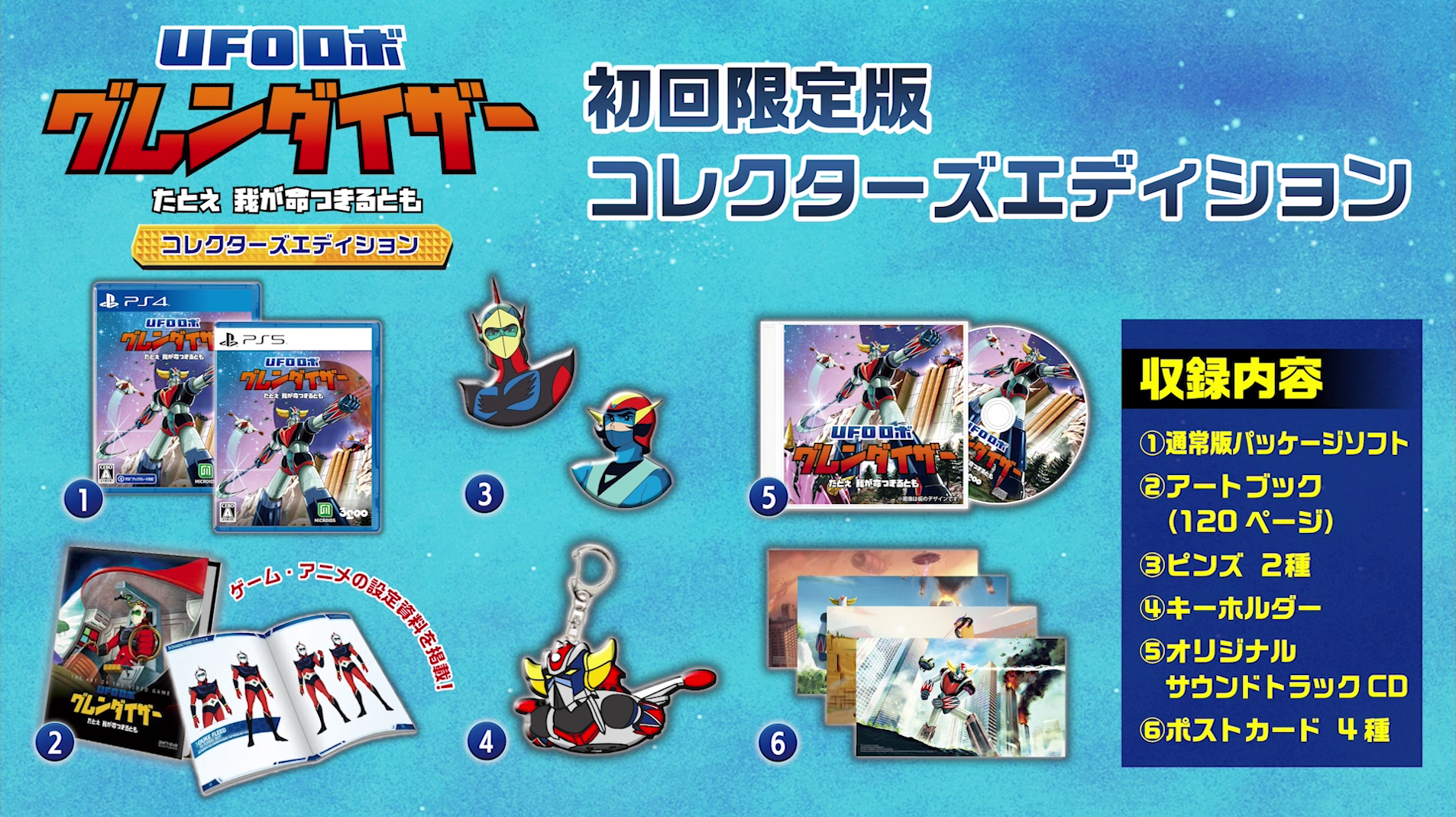 初回限定版コレクターズエディションに同梱される120ページのアートブックには、ゲームの設定資料と東映動画の貴重なアニメ設定資料の他、永井豪のスペシャルインタビューを収録。ここでしか手に入らないファン必携のエディションとなっております。