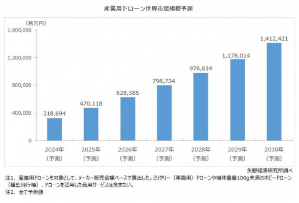 2000年代前後から中国や欧州、米国などでドローンのベンチャー企業が設立され、現在は高性能・高価格の機体が世界中で提供されている。日本でも同時期からドローンメーカーが誕生している。2024年の産業用ドローン世界市場(メーカー販売金額ベース)を3,186億9,400万円と予測する。ドローンは、多くの産業用途で事業が定着しており、市場拡大に向けて展開されている。