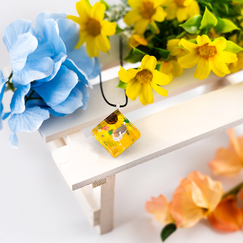 季節の花々に囲まれたニャンコ先生がデザインされたガラス製のネックレスは、