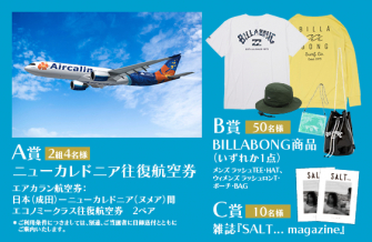 今年2月「BILLABONG」と「SALT...」がニューカレドニアへのサーフトリップを実施、知られざるニューカレドニアのサーフシーンを体験し、雑誌「SALT...」(2024年4月15日創刊)にて紹介します。このコラボ企画を記念して、ニューカレドニア行き往復航空券や豪華BILLABONG商品が当たるキャンペーンを実施します。