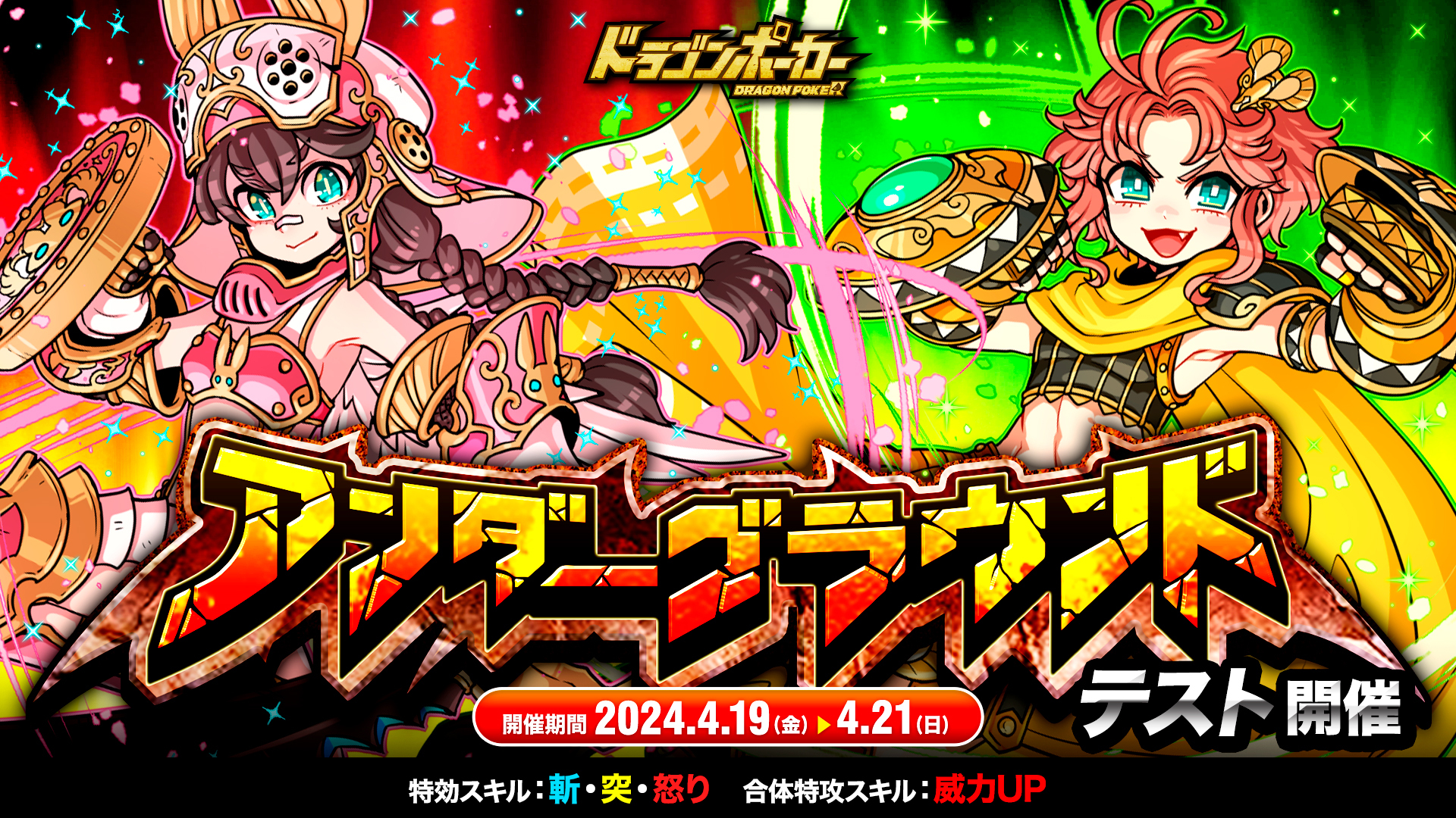 株式会社アソビズム(本社:東京都千代田区、代表取締役:大手智之)は、App Store・Google Playにて好評配信中のリアルタイム合体カードバトル『ドラゴンポーカー』で、2024年4月19日(金)より「アンダーグラウンド」をテスト開催いたします。