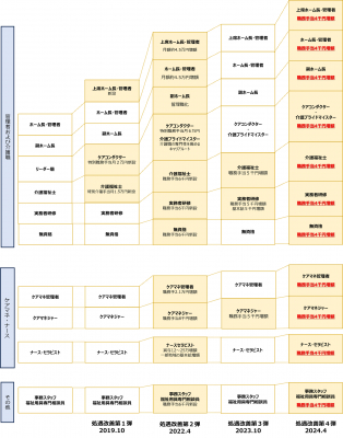 昇給は本来、保有スキル拡大や役割拡大を反映するものですが、介護未経験で入社する職員の大半は、入社後約5年間における保有スキル拡大や役割拡大のスピードが緩やかです。そのため、従来の制度では、昇給ペースも緩やかとなり、昇給実感の薄さがモチベーション低下に繋がっていました。今回の人事制度改定により、未経験で入社した職員であっても入社後5年間を従来よりも昇給しやすくすることで、安心して当社に入社し、学び、成長できる環境にしていきます。