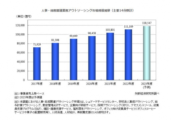 株式会社矢野経済研究所(代表取締役社長:水越孝)は、国内の人事・総務関連業務アウトソーシング市場を調査し、主要14分野サービスの動向、参入企業動向、将来展望を明らかにした。