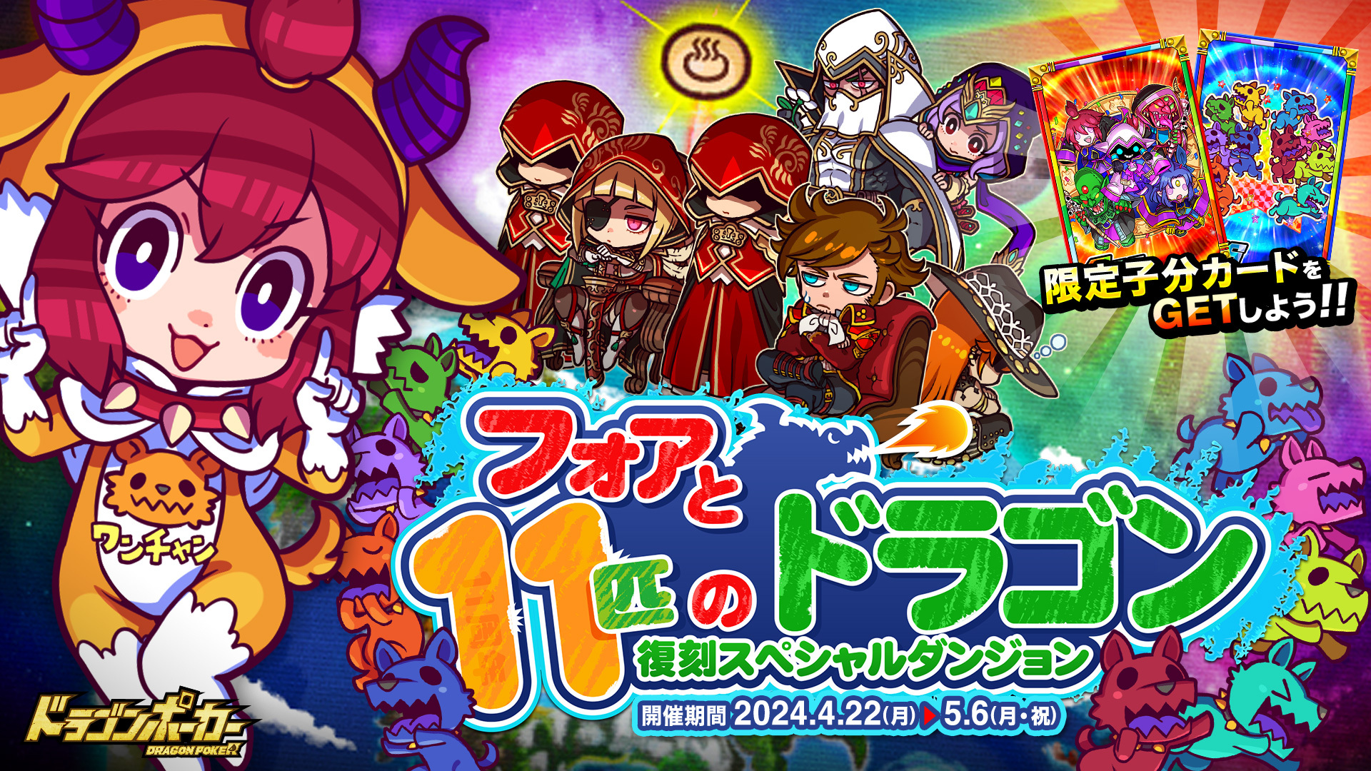 株式会社アソビズム(本社:東京都千代田区、代表取締役:大手智之)は、App Store・Google Playにて好評配信中のリアルタイム合体カードバトル『ドラゴンポーカー』で、2024年4月22日(月)より復刻スペシャルダンジョン「フォアと11匹のドラゴン」を開催いたします。
