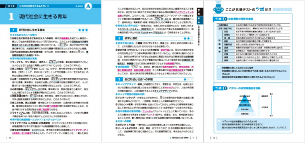 別冊で「地理[地理総合,地理探究]」には「重要統計チェックブック」が、「公共,政治・経済」、「公共,倫理」には「必携一問一答問題集」が付属しています。