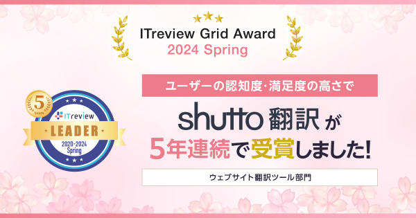 この度、Webサイト翻訳サービス「shutto翻訳」は、アイティクラウド社主催の「ITreview Grid Award 2024 Spring」において、ユーザーから高い評価を受け、ウェブサイト翻訳ツール部門で「Leader」を5年連続で受賞しました!
