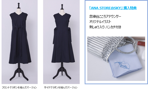 しわになりにくく、持ち運びに便利で、一枚で華やかに見えるワンピースは、落ち着いたネイビーカラーの柔らかな素材を採用し、場所や年齢・体型を選ばず、様々なシーンで活躍します。着回しがきくデザインで、リボンの結び方を変えることで違った雰囲気が楽しめます。ウエスト周りの調整が可能なため、移動時は締め付けず快適に過ごせるなど、移動が多いCAとアナウンサーならではのアイデアが詰まった一着です。