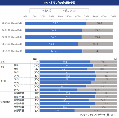 この程、TPCマーケティングリサーチ株式会社(本社=大阪市西区、代表取締役社長=松本竜馬)は、ホットドリンクの飲用実態と今後のニーズについて調査を実施、その結果を発表した。