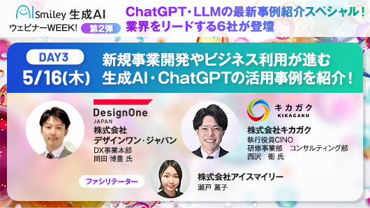 題して、AIsmiley生成AIウェビナーWEEK!第2弾、 ChatGPT・LLMの最新事例紹介スペシャル!業界をリードする6社が登壇、3日間にわたり様々なテーマで生成AIウェビナーを実施いたします。