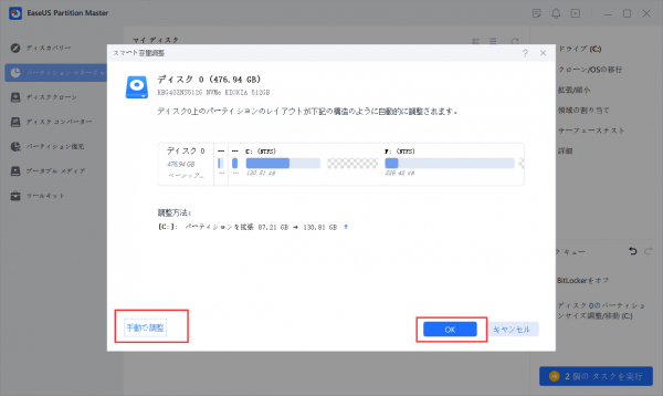 2.「OK」をクリックして、Cドライブを自動的に拡張します。また、「手動で調整」をクリックして、Cドライブを手動で拡張することもできます。