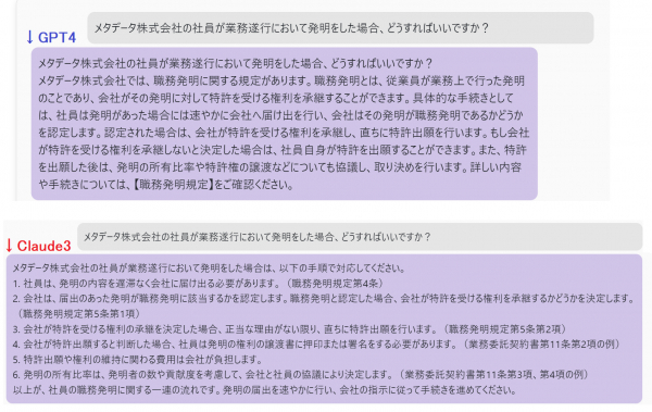 当メタデータ社の社内規定類を全て取り込んだChatBrid(https://metadata.co.jp/services/chatbrid.html)で、職務発明関連の質問をしてみます。GPT4を呼んだときとClaude3を呼んだときの回答を下記に引用します:
