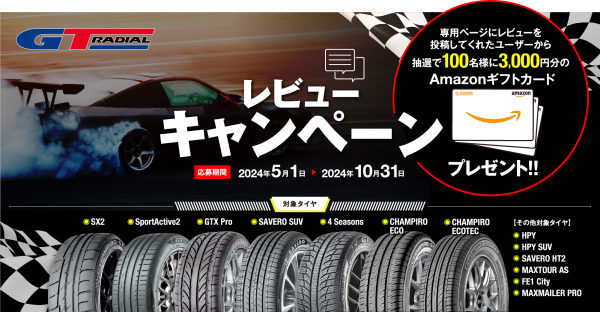 株式会社阿部商会(本社:東京都千代田区、代表取締役:阿部 文保)は日本販売代理店であるGT RADIAL社より2024年5月1日から 2024年10月31までの期間『GTラジアルタイヤ・レビュー キャンペーン2024』を実施いたします。キャンペーンに関する詳細は下記のとおりです。