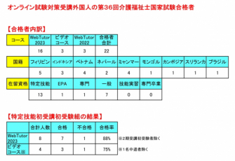 基本学習動画と復習ZOOM授業の組みわせで実施される「WebTutor2023コース」では、16名の外国人が合格しました。このコースでは、受講料について雇用施設側の支援を受けることができなかった特定技能外国人に対し、特別に受講料を免除しています。そのような特定技能介護職が24名在籍し、うち、8名が初めてのコース受講で国家試験にチャレンジしました。結果は、7名が合格を果たし、実に一発合格率が88%となりました。