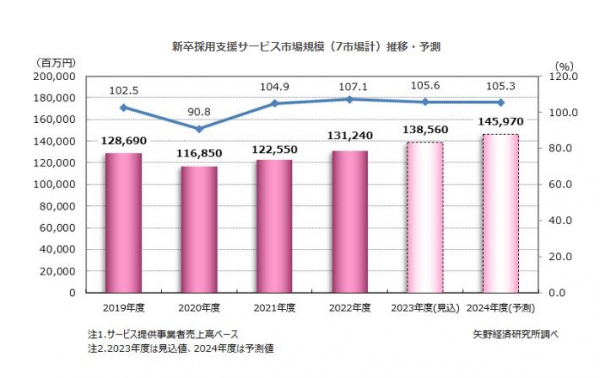 2023年度の新卒採用支援サービス市場規模(7市場計)は、サービス提供事業者売上高ベースで前年度比5.6%増の1,385億6,000万円を見込み、2024年度は同5.3%増の1,459億7,000万円を予測する。