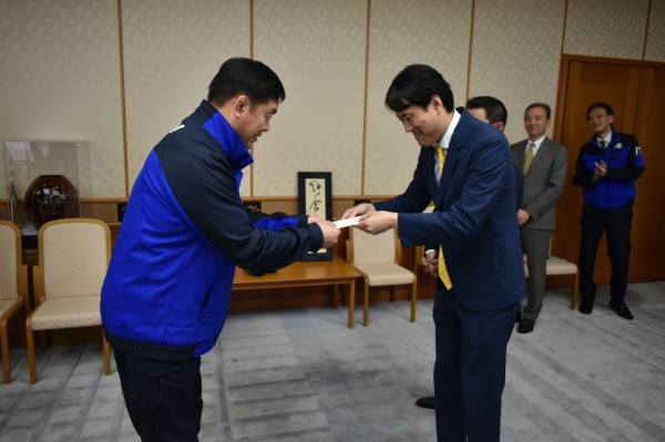 当社は、今年6月にコスタセレーナをチャーターし金沢発着クルーズを2本行います。それに先立ち、代表取締役2名が表敬訪問いたしました。当社は、今年元日に起きた令和6年能登半島地震の1日も早い復興を願い、1月~2月の同クルーズのご予約1部屋につき1,000円を石川県に寄付する旨を発表しておりましたが、この度、義援金として30万円を馳浩石川県知事に直接お渡しいたしました。当社といたしましては、チャータークルーズを成功させることにより、更なる復興支援につなげていきたいと考えております。