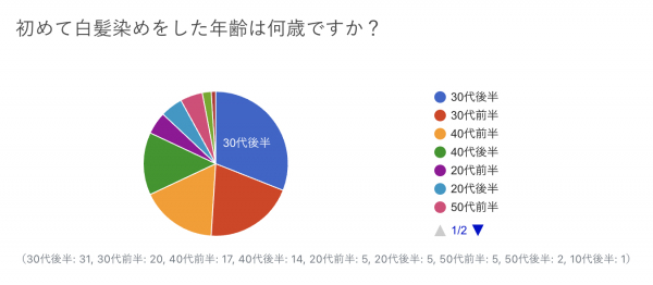 「初めて白髪染めをした年齢は何歳ですか?」のアンケート調査では、“30代後半”が31%で最多でした。