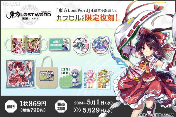 株式会社インクルーズ(東京都渋谷区、代表取締役社長 山﨑 健司)が企画・運営するフィジカルグッズのオンラインくじ「カワセルくじ」にて、2024年5月1日(水)より、「東方LostWord」のくじの2回目の【復刻再販】が開始となりました事をご報告させていただきます。