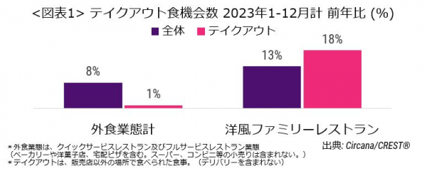 2023年1月-12月計の外食業態計(レストラン)の食機会数(客数)をみると(図表1)、全体で前年比8%増、テイクアウト(持ち帰り)の食機会数(客数)は、前年比1%増と緩やかに伸びました。