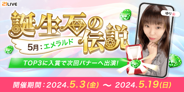 株式会社エムアンドティーティー(本社:沖縄県北谷町、代表取締役:井藤 三知子)が運営するエンターテイメント・ライブ配信アプリ【21LIVE(ニーイチライブ)】URL: https://21.live では、5月3日(金)より定期イベント「誕生石の伝説」を開催。上位入賞ライバーにはバナー出演権や配信初期値ボーナスを進呈いたします。