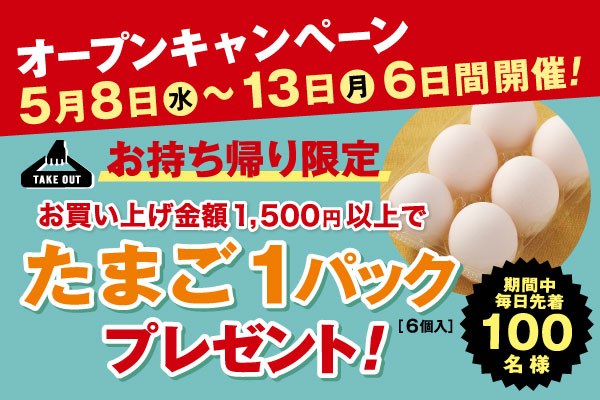 お持ち帰りで1,500円(税込)以上ご注文のお客様に、たまご1パック(6個入り)をプレゼントいたします。