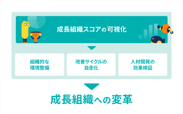 これらの5つの区分で成長組織スコアを構成し、それぞれの要素を調査・分析することにより、成長環境を相対的・継続的に計測。人材の成長を促せる魅力的な職場を築く指針が得られます。