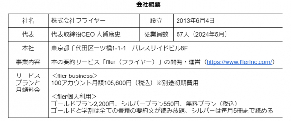 株式会社フライヤーは、本の要約サービス「flier(フライヤー)」を運営する、ITベンチャー(2013年6月設立)です。最大の特長は「書評(レビュー)」ではなく「要約」である点です。書き手の主観が入る書評とは異なり、著者の主張や論理(重要ポイントや全体像)を忠実にまとめ、読者に伝えます。書評でないため、出版社と著者から要約の許可を得る必要があり、要約した原稿にも目を通していただくことで、高品質なサービスを提供しています。